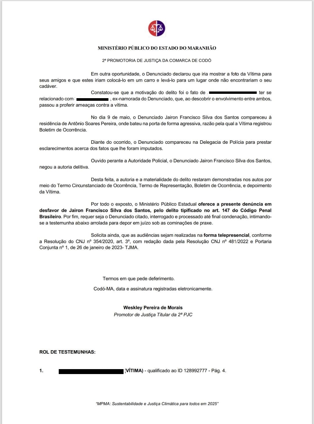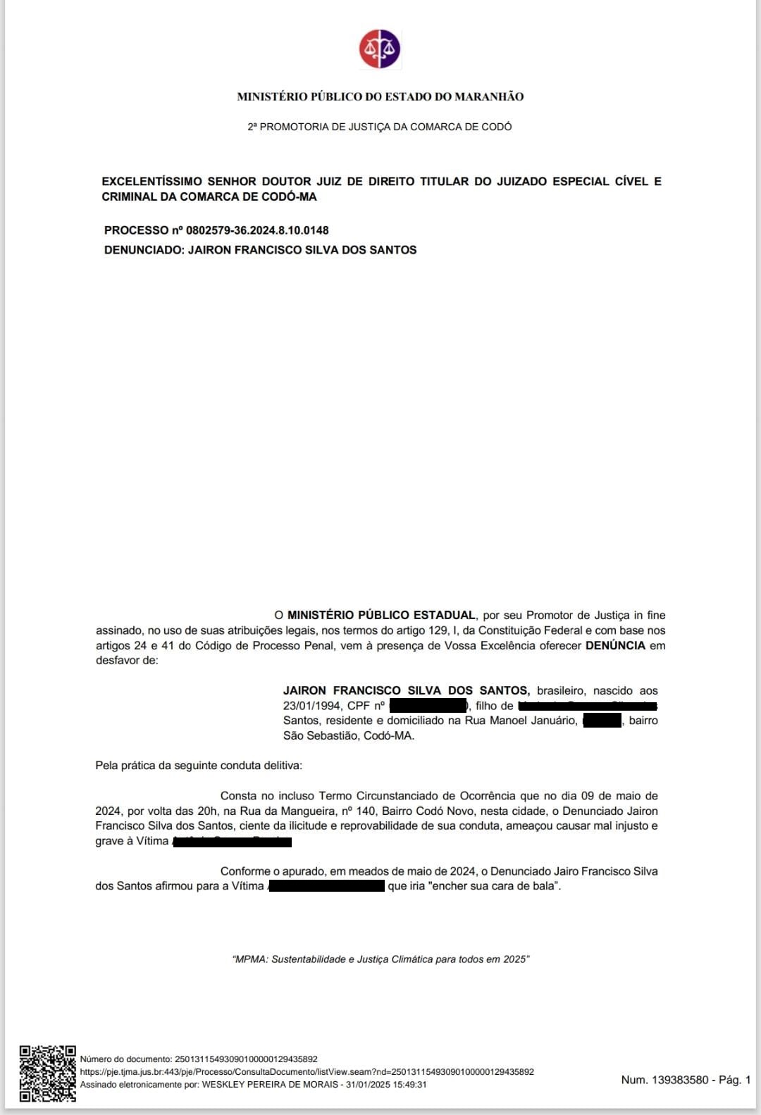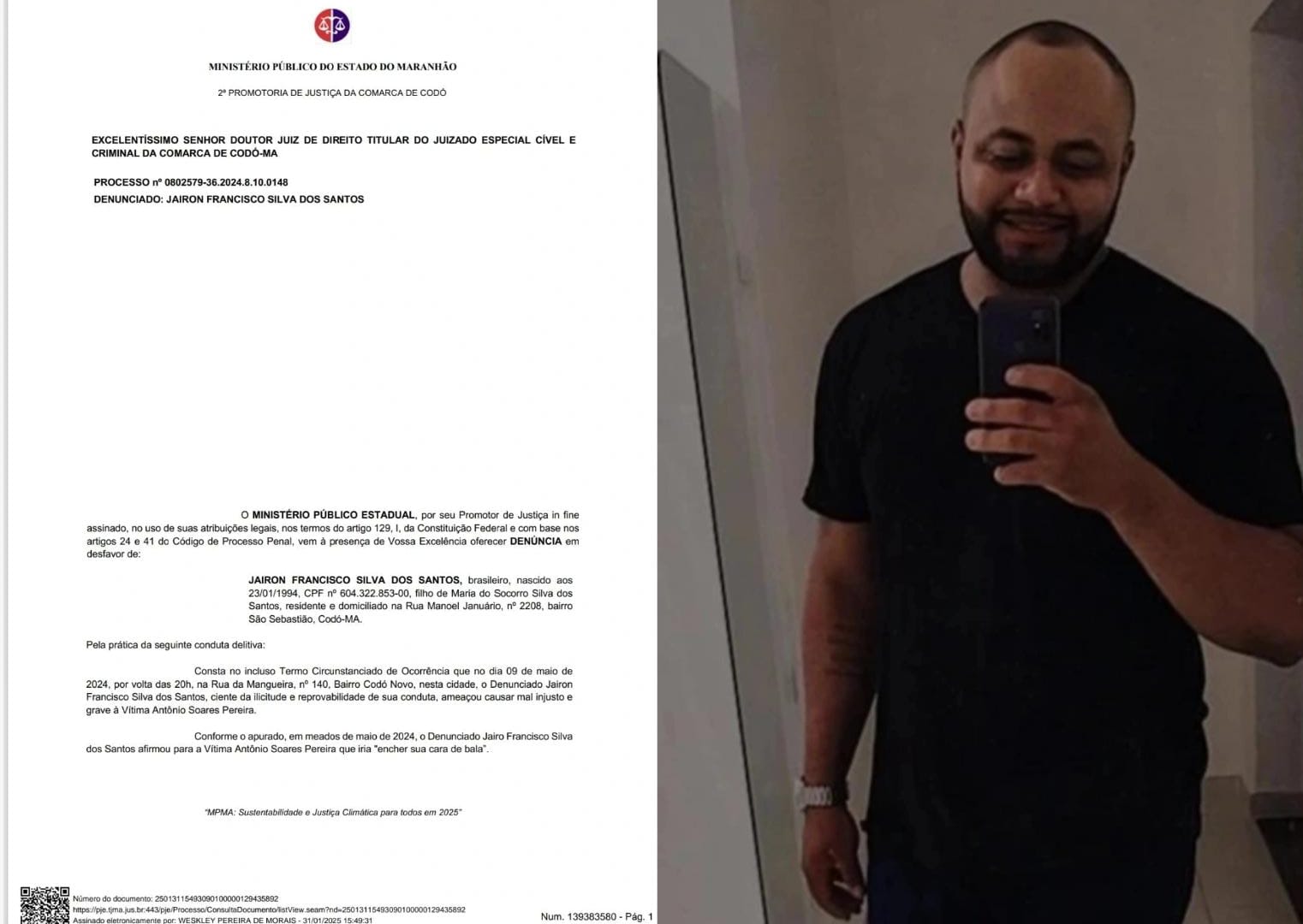 De acordo com a denúncia, à qual a reportagem teve acesso , Jairon é acusado de ameaçar de morte outro homem no dia 9 de maio de 2024, no bairro Codó Novo.
