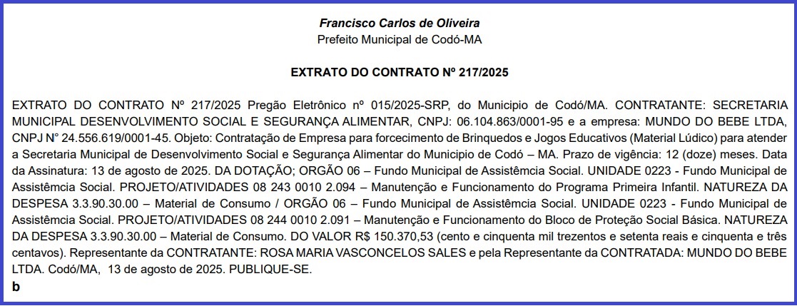 Desta vez, a Secretaria Municipal de Desenvolvimento Social e Segurança Alimentar, comandada pelo governo do prefeito Chiquinho do PT – pai do deputado Francisco Nagib – assinou um contrato no valor de R$ 150.370,53 para o fornecimento de brinquedos e jogos educativos (material lúdico) destinados a programas sociais do município. O prazo de vigência é de 12 meses.