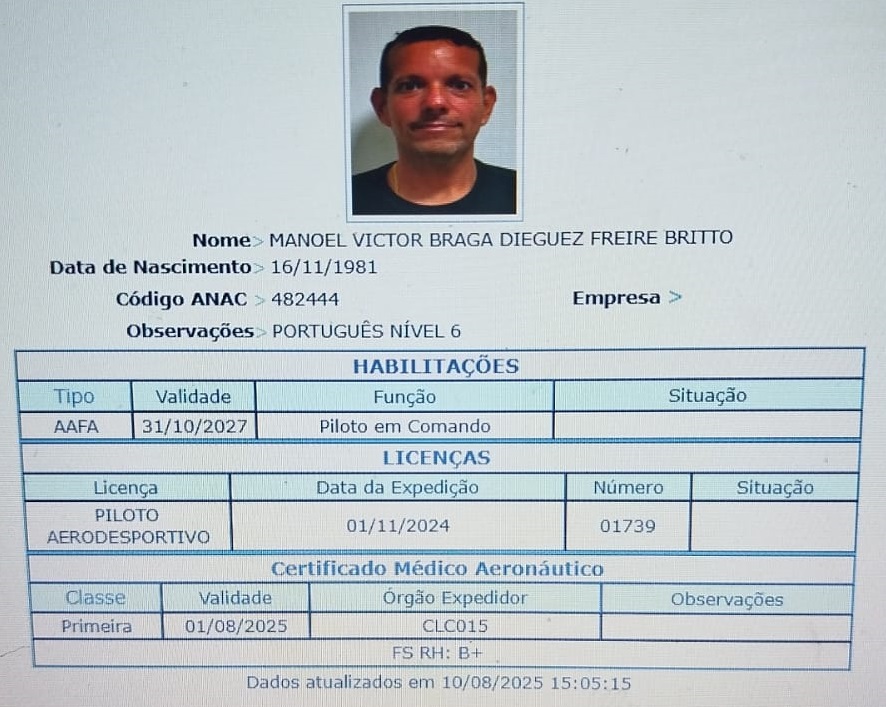 Levantamento exclusivo do Marco Silva Notícias revelou que Manoel Victor possuía licença da Agência Nacional de Aviação Civil (Anac) na categoria piloto aerodesportivo (CPA), obtida há apenas nove meses e nove dias. Além disso, ele estava com o Certificado Médico Aeronáutico (CMA) vencido desde 1º de agosto.