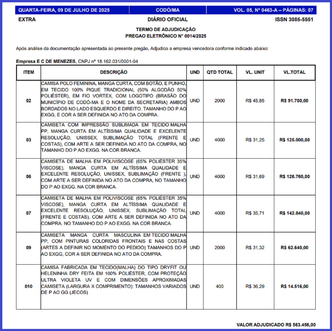 A mais nova contratação foi feita pela Secretaria Municipal de Saúde, que assinou com a empresa FENIX EMPREENDIMENTOS (E C DE MENEZES – ME) um contrato de R$ 563.456,00 para a fabricação de 16.400 camisas e camisetas. O número causa espanto por ser muito maior que a quantidade atual de servidores da área da sáude.