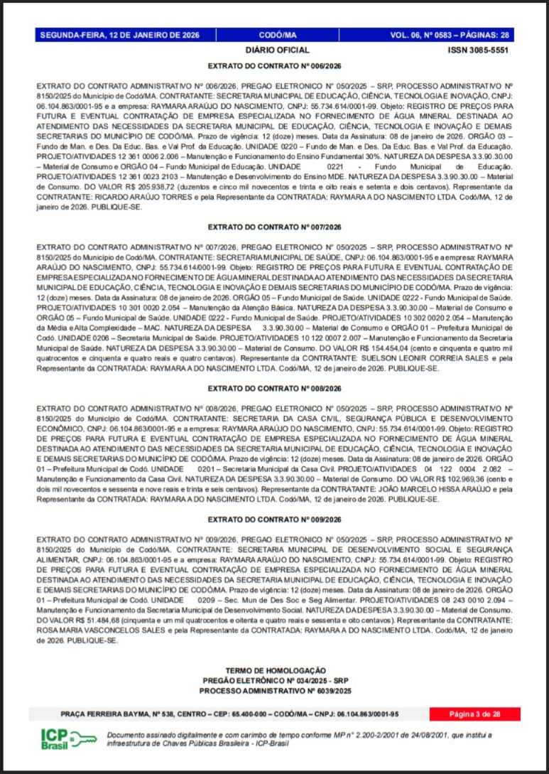 Outro ponto que chama atenção é o fato de que os contratos foram assinados no mesmo dia, 8 de janeiro de 2026, e publicados em sequência no Diário Oficial, reforçando a impressão de um pacote fechado previamente, sem diversidade de empresas vencedoras.