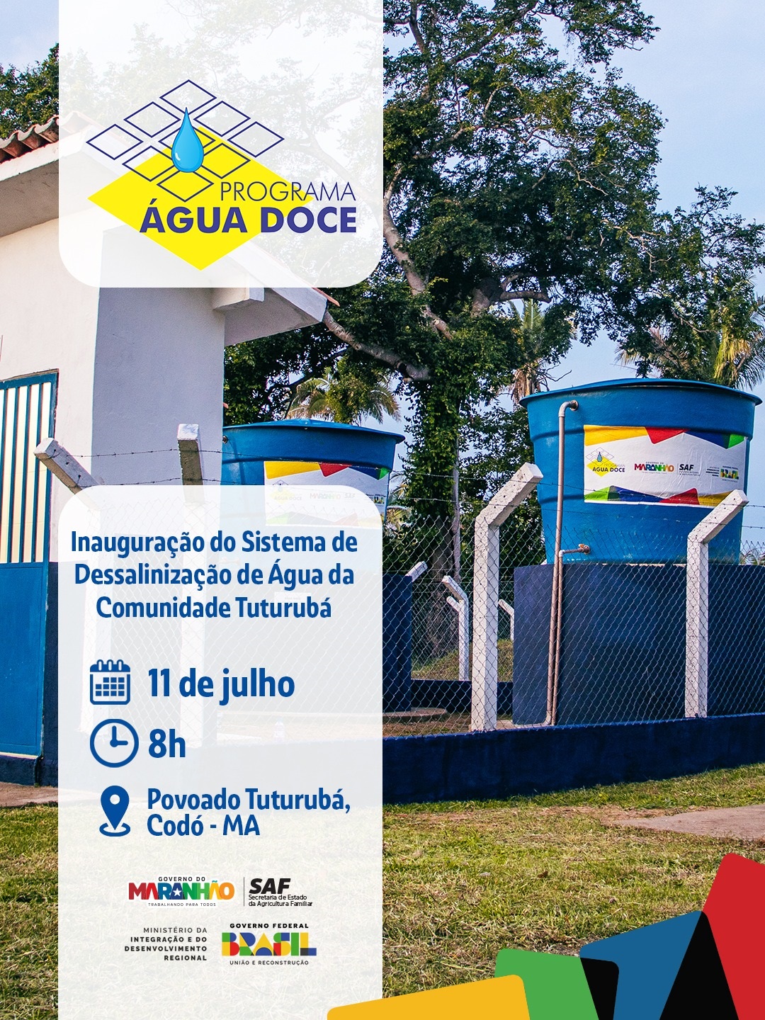 Com foco na segurança hídrica e no fortalecimento da cidadania, o Programa Água Doce (PAD), coordenado pelo Ministério da Integração e do Desenvolvimento Regional (MIDR) e implementado no Maranhão pela Secretaria de Estado da Agricultura Familiar (SAF), inaugura, nesta sexta-feira (11), o segundo Sistema de Dessalinização de Água, desta vez na comunidade Tuturubá, no município de Codó.