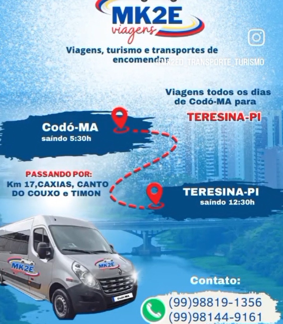 A empresa MK2E Viagens está com rotas diárias de transporte de passageiros entre Codó (MA) e Teresina (PI), oferecendo um serviço prático, seguro e confortável para quem precisa se deslocar entre as duas cidades.